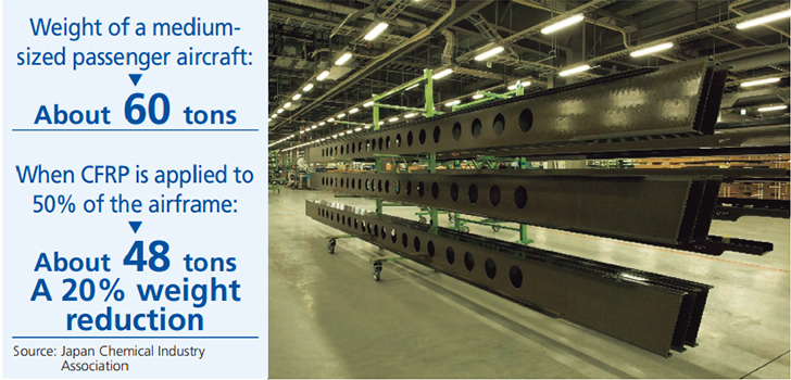 As for the environmental performance required for aircraft, reductions made to the weight of the airframe contribute to reduced fuel consumption, leading to reduced CO2 emissions. While the main raw materials for conventional aircraft are metals such as aluminum and steel, there is a growing trend of replacing these with carbon fiberreinforced plastics (CFRP), which are lighter and feature similar strength and safety.