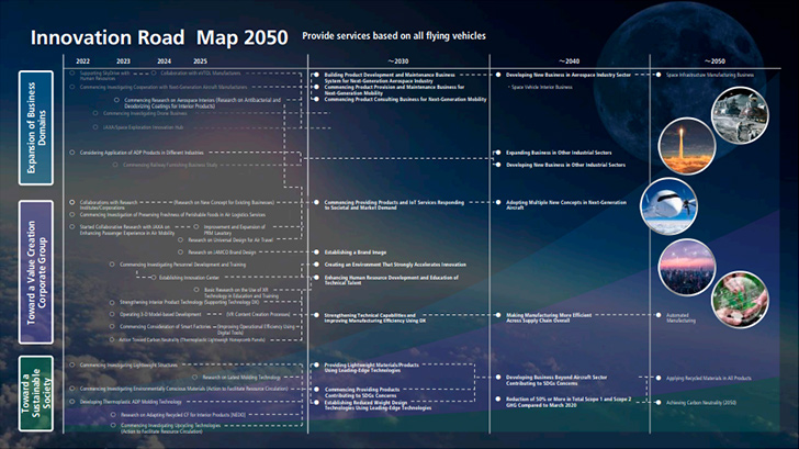 In the JAMCO Vision 2030, we define a “Value Creation Corporate Group” as one that provides comfortable spaces in transport, worthwhile environmental performance, and safe operating environments in the next-generation mobility market. We conduct research and development to evolve our technology alongside innovation, incorporate it into our manufacturing, and offer products and services of value to our customers.