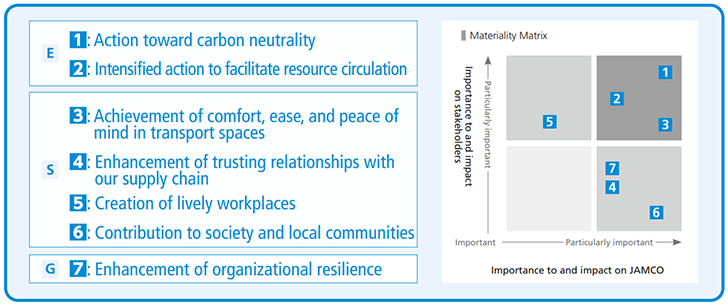 - The issues identified and organized in STEP 1 were evaluated from JAMCO’s own perspective as well as that of its stakeholders.