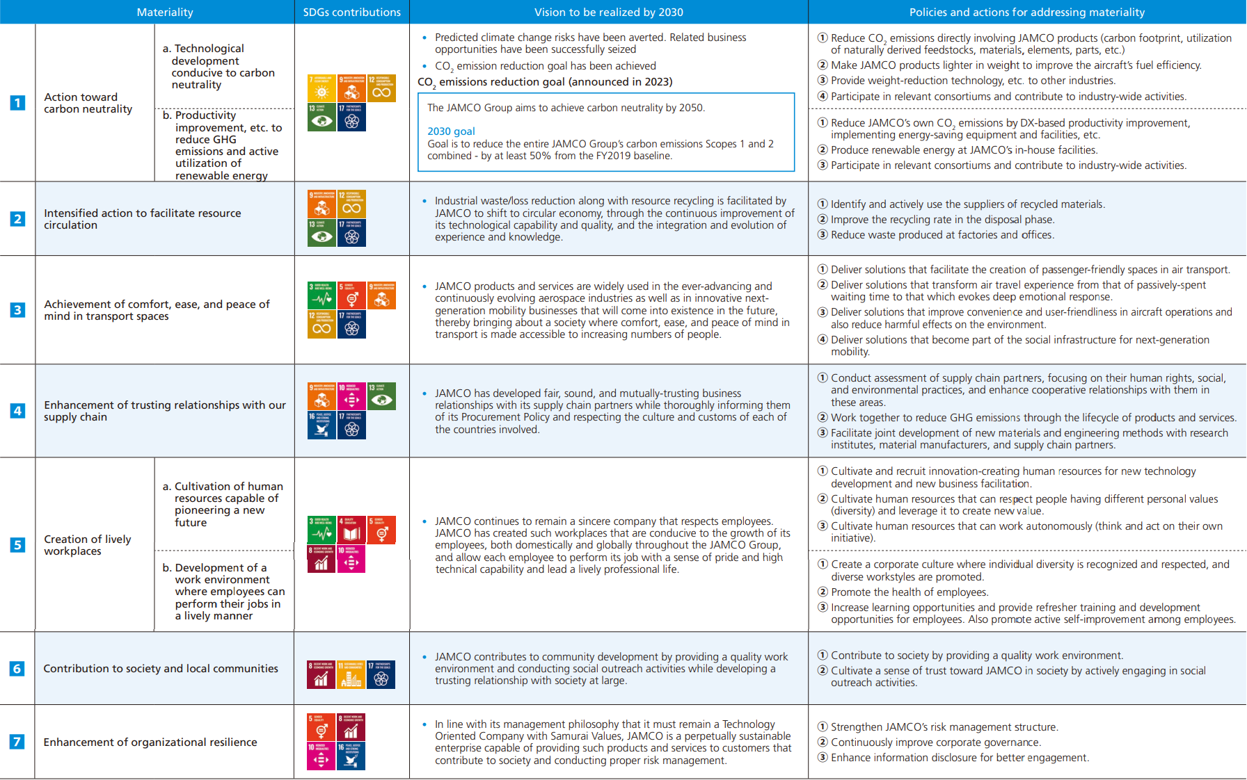 Materiality was identified while ensuring consistency with JAMCO Vision 2030, which describes the future state of society that the company will strive to bring about.