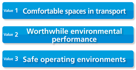 The various values that JAMCO provides can be sorted into three main categories: Comfortable spaces in transport, worthwhile environmental performance, and safe operating environments. These values are the marshaling of our proprietary technologies, with which we have built trust relations with our customers through aircraft-based manufacturing and maintenance. Going forward, we will achieve sustainable growth together with our customers by continually creating new value with technology and personnel as core competencies.